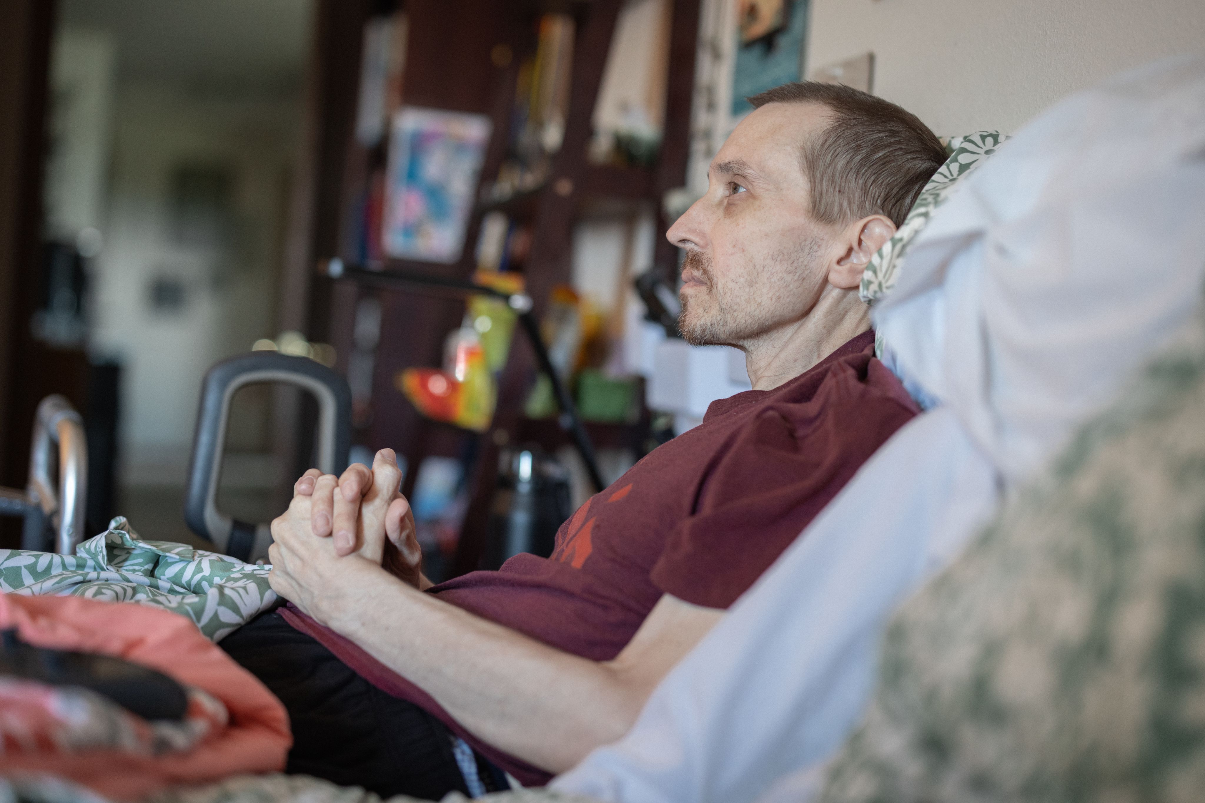 We've been talking for...well, it's hard to say. Time dissolved once we crossed the threshold. The only clock in my eye line hides on the nightstand next to Chad's side of the bed, obscured by the insulated tumbler from which he carefully pulls mouthfuls of water, a gray oval handle he uses to hoist himself onto his walker, a lamp.