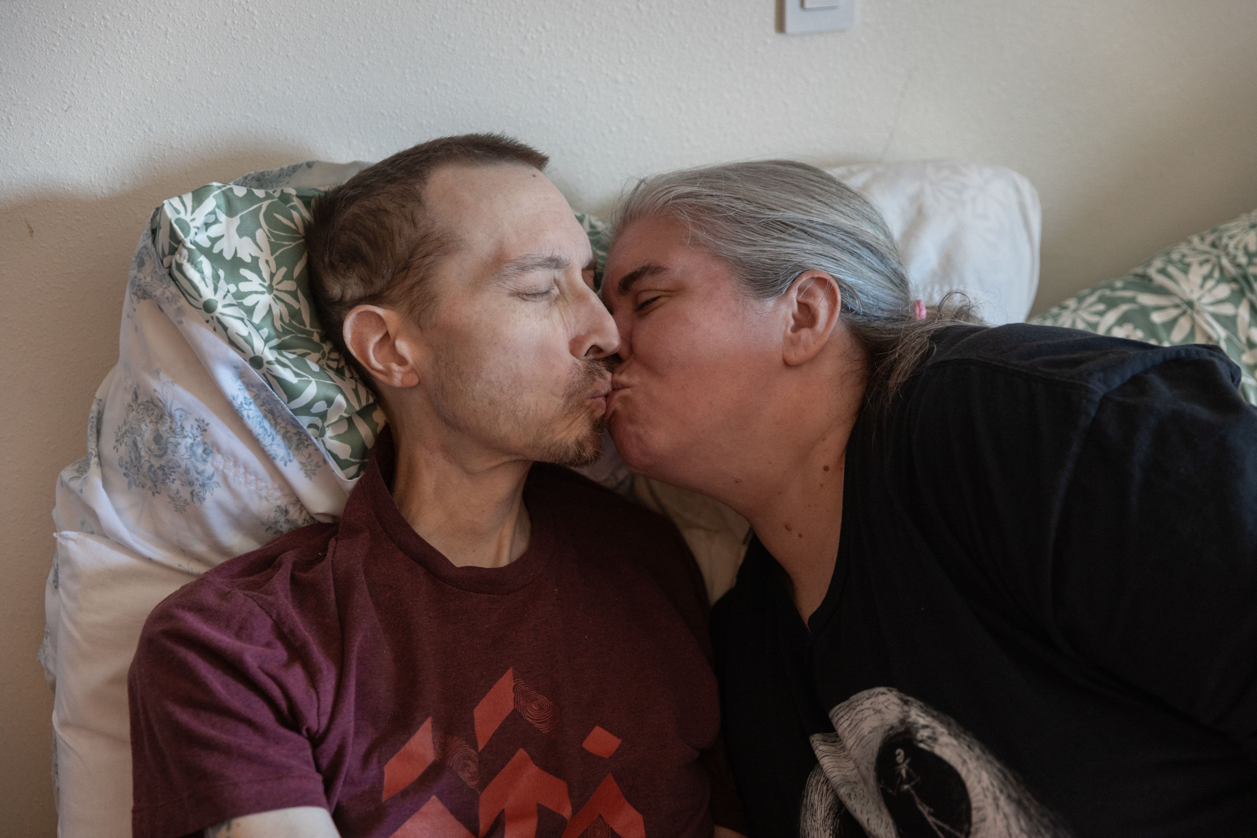 Chad and Becky are perfect together. That's what should command your attention as you sit in their bedroom. Not the shelves of food and medicine, Chad's walker, his devices of assistance and comfort, or the asymmetrical outline of the remainder of him concealed under the blanket's enthusiastic pastels.
