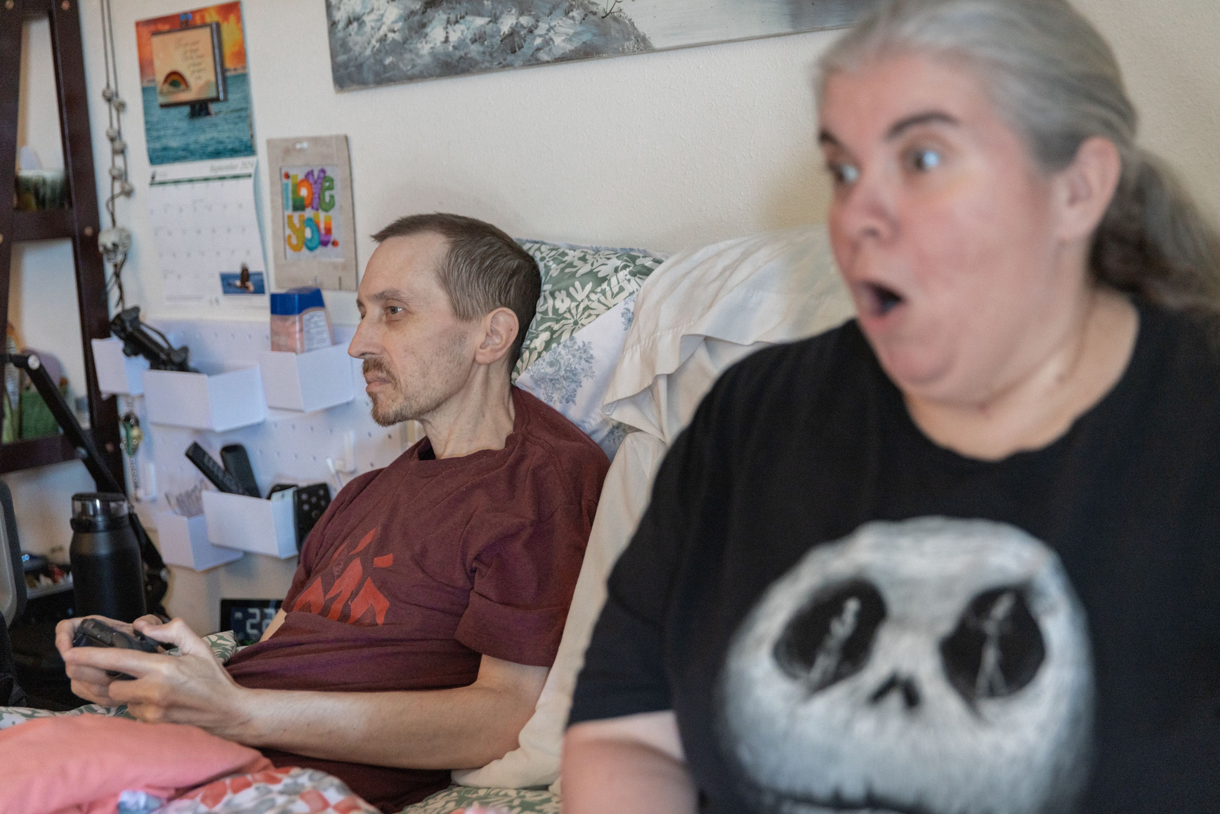 Chad and Becky are gaming together. They sit next to each other on the bed, tapping and triggering matching controllers, lost in a world that doesn't exist.