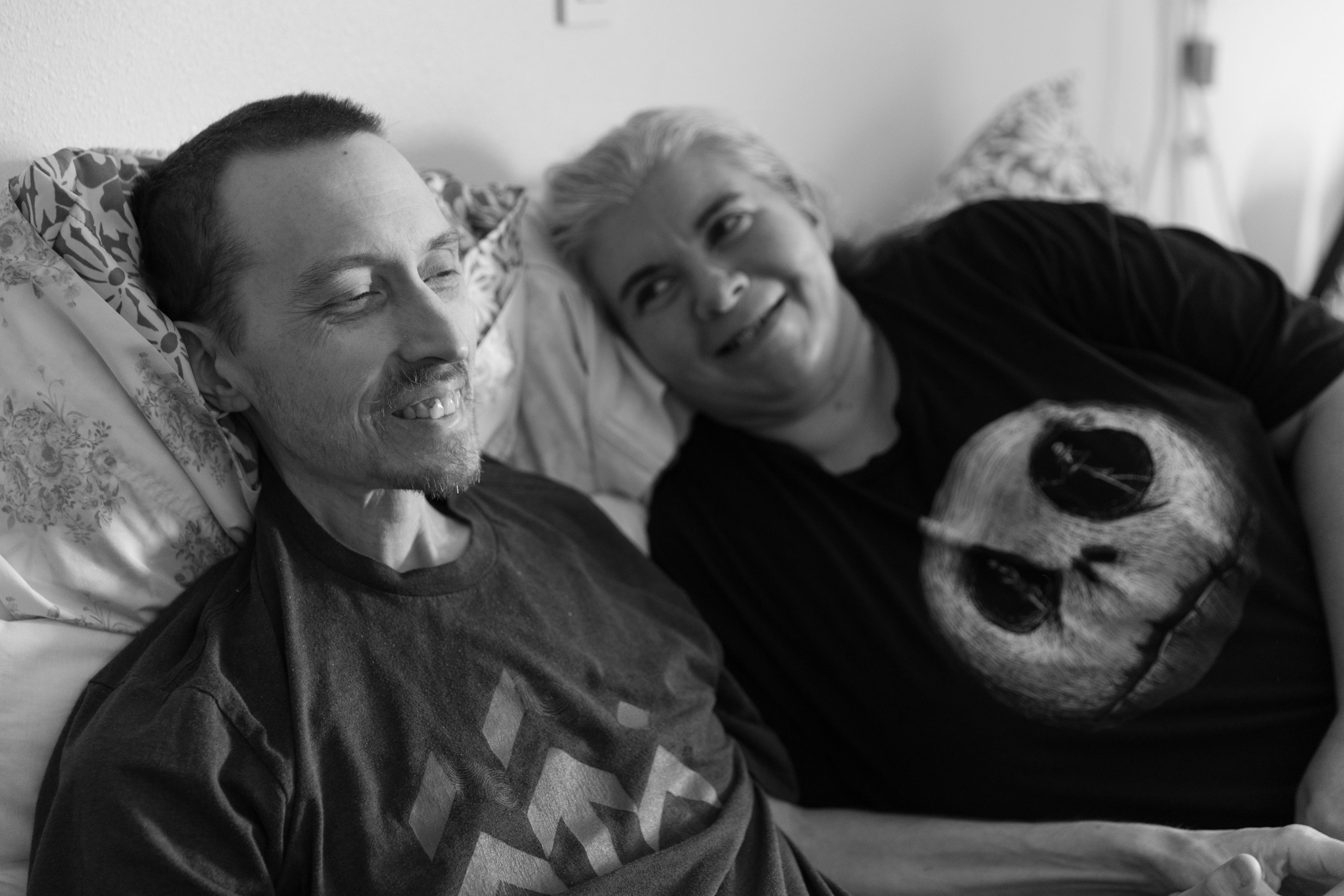 Becky alights from her chair next to me and rounds to her side of the bed, tiptoeing over a dozing nebula of cat hair named (yes, really) Kitty to cuddle beside her husband. She nestles her hand in his and sneaks glances at him that are both playful and measured; affection and concern, emotions reluctantly conjoined in her face and heart.